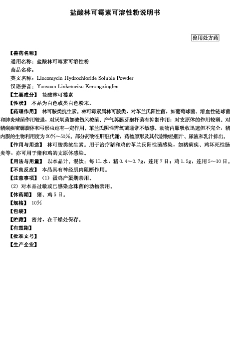用于巴氏桿菌和大腸桿菌所致的細菌性疾病。