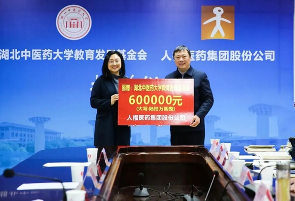 ? ? ? 3月23日,人福醫藥集團與湖北中醫藥大學教育發展基金會舉行捐贈儀式,人福醫藥集團旗下武漢人福醫療管理有限公司向湖北中醫藥大學教育發展基金會捐贈60萬元。捐贈將在學校教育發展基金會設立“武漢人福醫療專項基金”,用于大學生創新創業項目扶持,培育創新創業成果;支持中醫藥產業發展相關的人才培養;助力校友活動。湖北中醫藥大學黨委書記唐峻,湖北中醫藥大學校長、教育發展基金會副理事長呂文亮,湖北中醫藥大學副校長、教育發展基金會副理事長黃必勝,湖北中醫藥大學校黨委常委張子龍,人福醫藥集團總裁鄧霞飛、人福醫藥集團黨委副書記孔娜、武漢人福醫療管理有限公司董事長曾志敏等領導共同參加捐贈儀式。
