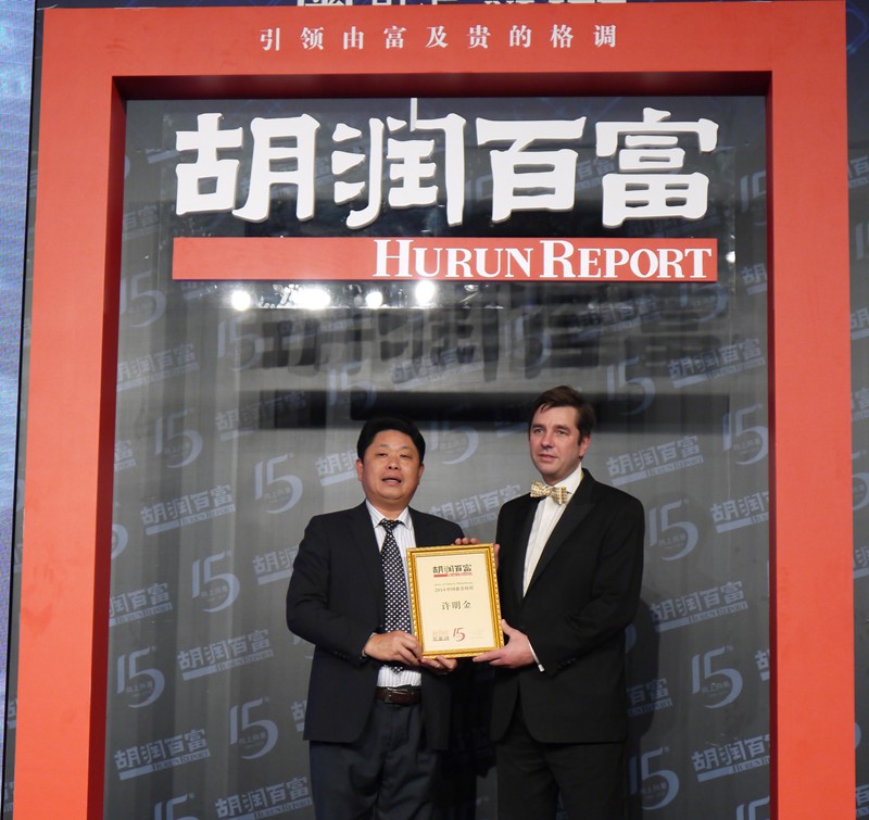 圖為胡潤先生親自為集團(tuán)主席許明金先生頒獎(jiǎng)