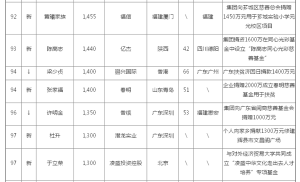 2015年4月18日,上海。胡潤研究院發(fā)布《2015胡潤慈善榜》,100名中國最慷慨的慈善家上榜。2014年4月1日至2015年3月31日的現(xiàn)金捐贈、和現(xiàn)金相關(guān)的捐贈,以及有法律效力的承諾捐贈都統(tǒng)計在內(nèi)。若以企業(yè)名義捐贈,企業(yè)捐贈額乘以企業(yè)家所持股份比例后計入企業(yè)家個人捐贈。胡潤研究院自2004年首創(chuàng)慈善榜以來,堅持尋找中國的卡耐基,引領中國企業(yè)家尋找自己的慈善方向。集團董事局主席許明金先生榮登榜單。
